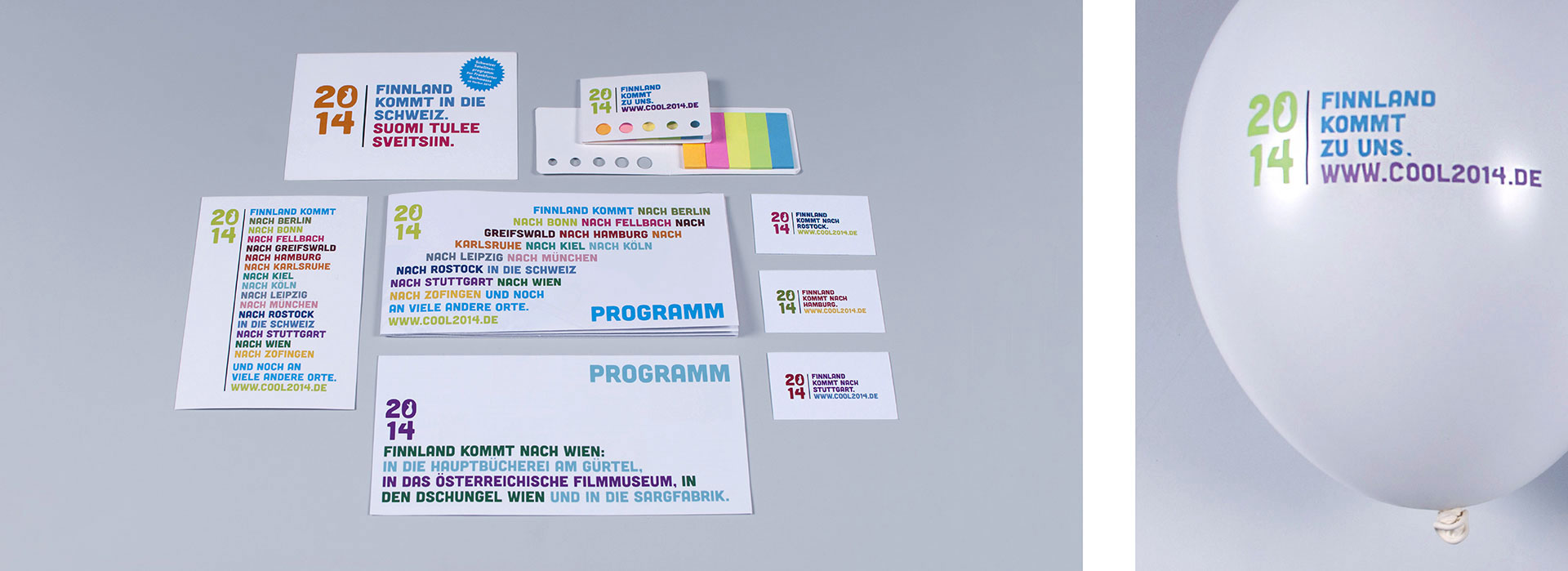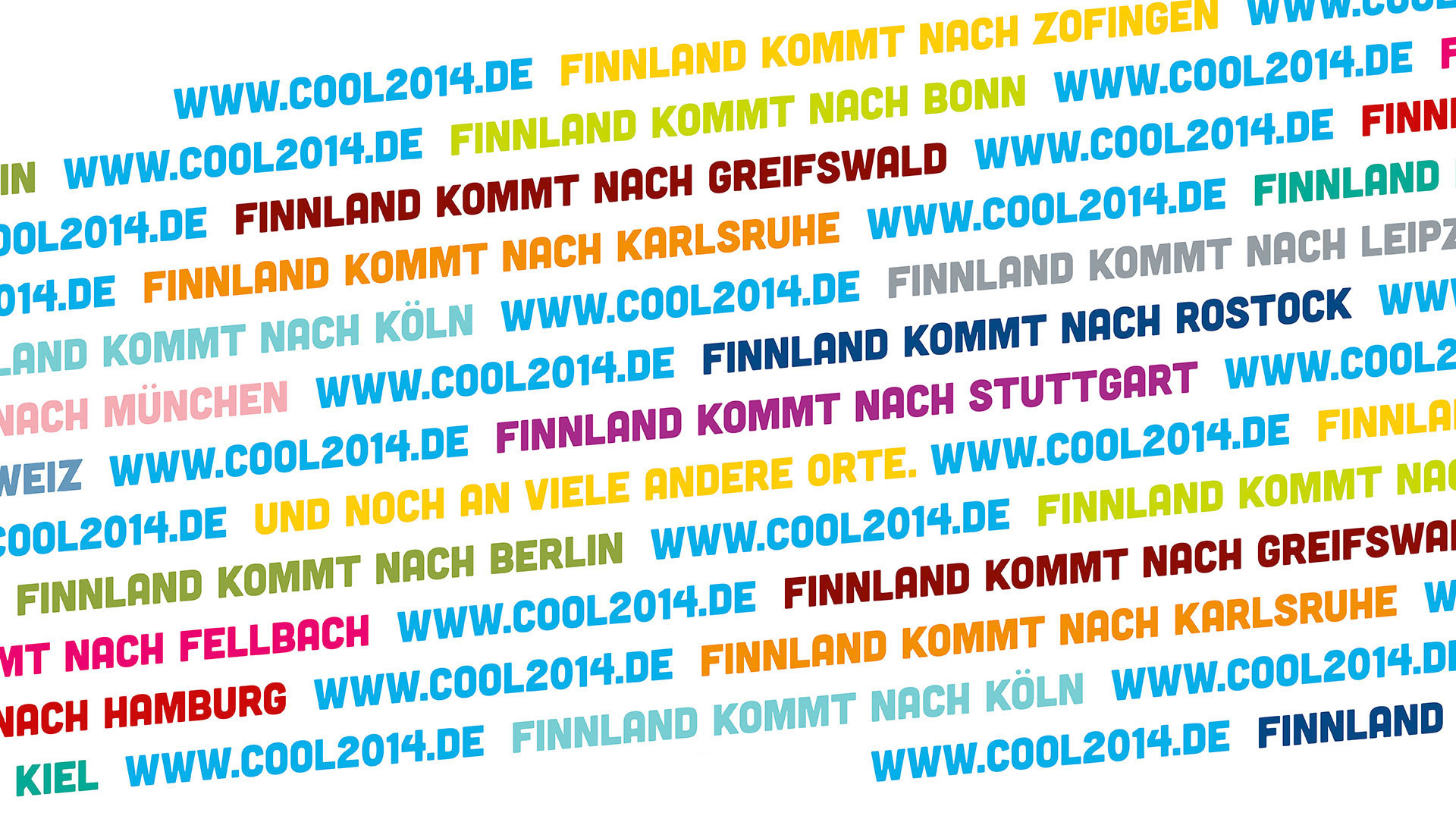 Finnland war Ehrengast der Frankfurter Buchmesse 2014. Für das Finnland-Institut war es meine Aufgabe, den begleitenden 200 Veranstaltungen in Deutschland, Österreich und der Schweiz ein einheitliches, wiedererkennbares Äußeres zu geben. Die Städte bekamen dafür ein eigenes Logo mit der markanten »2014«. Unter »www.cool2014.de« wurde eine zentrale Landing Page eingerichtet. So haben wir z.B. auf Roll-Ups vor Ort mit einfachen Mitteln eine starke Präsenz erzeugt. Die lokalen Partner bekamen ein kleines Corporate Design-Paket und konnten so die Umsetzung von zusätzlichen Materialien selbst übernehmen.