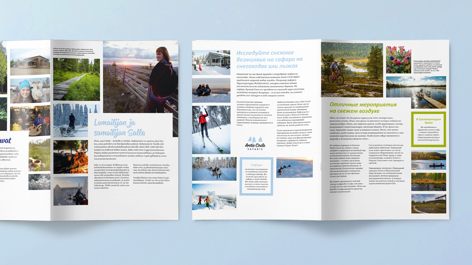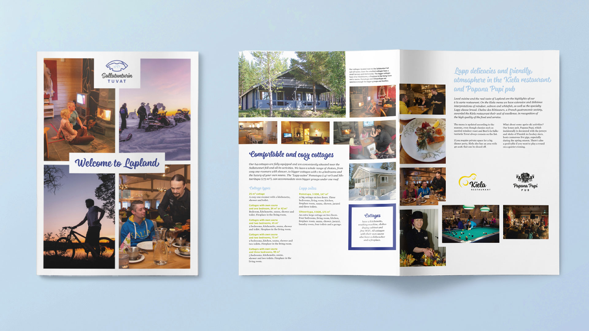 Seit über 40 Jahren bietet Sallatunturin Tuvat seinen Gästen Urlaub in eigenen Ferienhäusern mit Sauna im Nordosten Finnlands. Und nicht nur das: Mit dem hauseigenen Motorschlitten-Touren-Anbieter Arctic Circle Safaris können Ausflüge in die umgebenen Schneelandschaften zum Beispiel zum Ruuhitunturi Café unternommen werden, die Gäste können im Restaurant Kiela speisen und den Abend im Pub Papana Pupi ausklingen lassen. Nach und nach haben wir das Erscheinungsbild von Sallatunturin Tuvat und den Tochterunternehmen überarbeitet und so gemeinsam ein neues, stimmiges Gesamtdesign entwickelt.